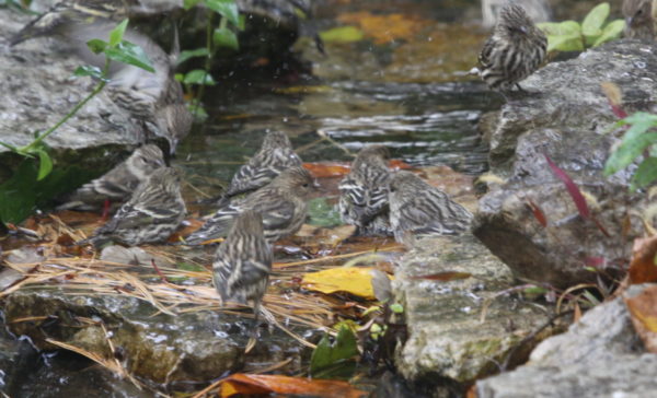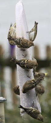 Irruptive species come south when their food source has been depleted (due to drought or some other event). Other irruptive species are also showing up in unusual numbers. The scientific name for the pine siskin is carduelis pinus: carduelis comes from the Latin word carduus for thistle (of which they eat a lot), and pinus also from the Latin meaning pine, which is a favorite nesting place for them.