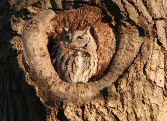 Unusual for owls, there are 2 color variations (morphs), red and grey morphs. They may be found in areas of deciduous forests, but sleep during the daytime in cavities, or even nesting boxes that have been set up for them. They have asymmetrical ears (one higher than the other) that allow them to find prey by sound.
