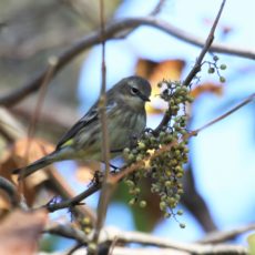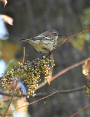 Birder’s Notebook by Bob Andrini; 2 October Entry. The yellow-rumped warbler is one of the first warblers to appear during the spring migration, and one of the last to show during the fall migration. I have been seeing a lot of yellow-rumps this past week, so warbler migration is probably ending. The scientific name of the yellow-rumped warbler is Dendroica coronata – Dendroica comes from the Greek meaning ‘tree dwelling’; coronata is from the Latin meaning ‘adorned with a wreath or crown’. The name fits them since they spend so much time in the trees, and they so have a crown of yellow (although you don’t always see it).