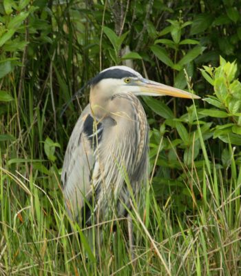 The scientific name for the great blue heron is Ardea herodias: Ardea comes from the Latin meaning heron; herodias from the Greek also meaning heron. Great blue herons stand and fly with their neck in an “S” shape. When flying they appear prehistoric with the curved neck and 6-foot wingspan. They feed in shallow ponds and river edges but may also be found feeding in fields and meadows looking for rodents and snakes.