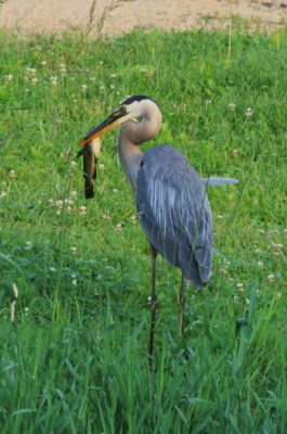 Birder’s Notebook by Bob Andrini; 16 August Entry. A common bird on ponds and rivers in our area is the great blue heron. Many people recognize them by their color and size. The large birds stand very stoic as they wait for their food to come swimming by – what a way to get a meal.