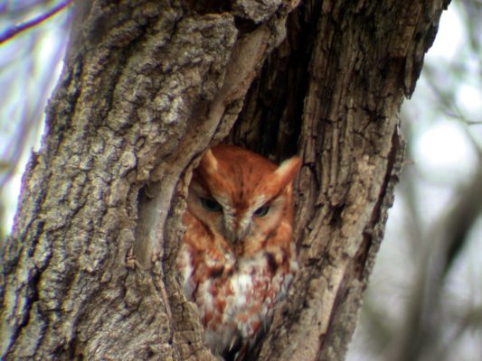 Unusual for owls, there are 2 color variations (morphs), red and grey morphs. They may be found in areas of deciduous forests, but sleep during the daytime in cavities, or even nesting boxes that have been set up for them. They have asymmetrical ears (one higher than the other) that allow them to find prey by sound.