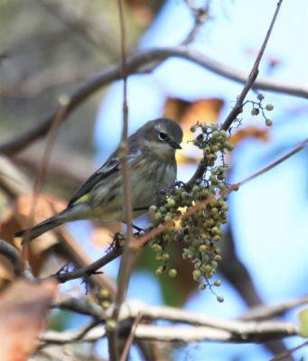 Birder’s Notebook by Bob Andrini; 2 October Entry. The yellow-rumped warbler is one of the first warblers to appear during the spring migration, and one of the last to show during the fall migration. I have been seeing a lot of yellow-rumps this past week, so warbler migration is probably ending. The scientific name of the yellow-rumped warbler is Dendroica coronata – Dendroica comes from the Greek meaning ‘tree dwelling’; coronata is from the Latin meaning ‘adorned with a wreath or crown’. The name fits them since they spend so much time in the trees, and they so have a crown of yellow (although you don’t always see it).