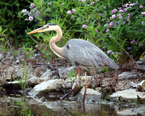 Birder’s Notebook by Bob Andrini; 16 August Entry. A common bird on ponds and rivers in our area is the great blue heron. Many people recognize them by their color and size. The large birds stand very stoic as they wait for their food to come swimming by – what a way to get a meal.