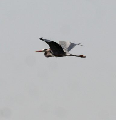 The scientific name for the great blue heron is Ardea herodias: Ardea comes from the Latin meaning heron; herodias from the Greek also meaning heron. Great blue herons stand and fly with their neck in an “S” shape. When flying they appear prehistoric with the curved neck and 6-foot wingspan. They feed in shallow ponds and river edges but may also be found feeding in fields and meadows looking for rodents and snakes.